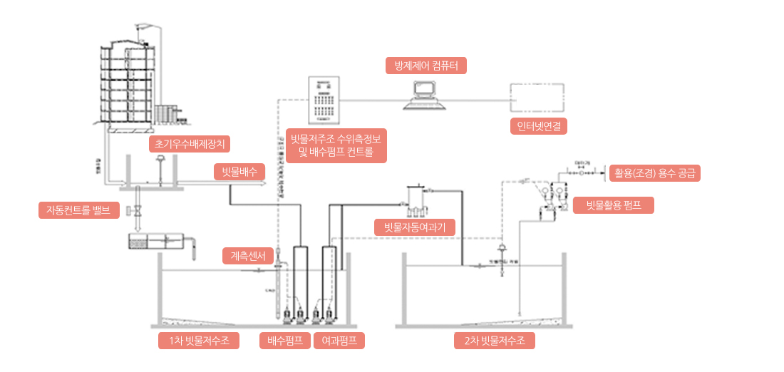 빗물을 모아 생활용수 ,조경용수, 공업용수 등으로 이용할수 있도록 처리하는 시설이다. 집수시설, 여과장치등처리시설, 저류시설, 수처리시설, 송수-배수시설로 구성되어있다.